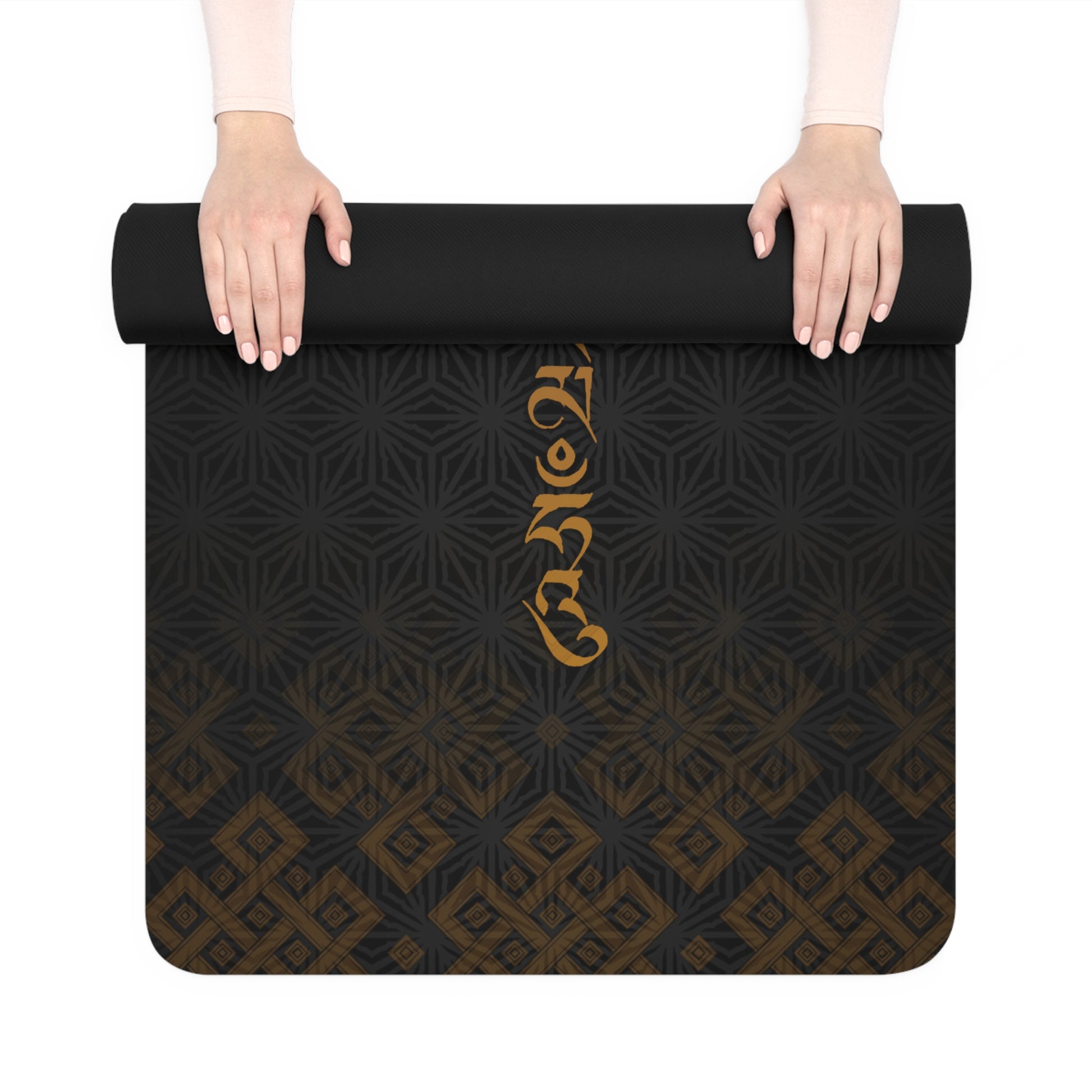 MAHAKALA yoga mat with an anti-slip rubber bottom for extra stability, this yoga mat helps you better balance during any pose and absorbs impact, delivering a higher comfort factor for all your exercise. The script is in Umed & Uchen of the Om Mani mantra.
